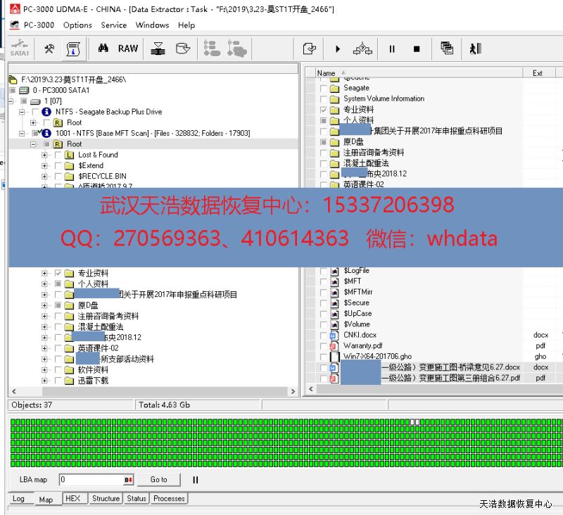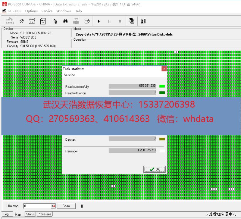解决方案:收到硬盘后,在无尘环境更换匹配的磁头,接到数据恢复工具PC-3000 UDMA Express上,通电硬盘认盘,DE分头镜像,成功恢复硬盘里面大多数的客户个人资料和工作资料!