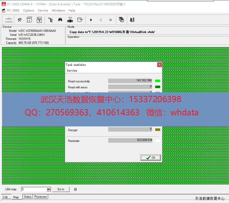 解决方案:收到硬盘后,我们在无尘环境打开硬盘,更换兼容的磁头,再接到专业的数据恢复工具上,通电硬盘认盘,DE分头镜像,成功恢复硬盘里面的几乎全部工作数据!