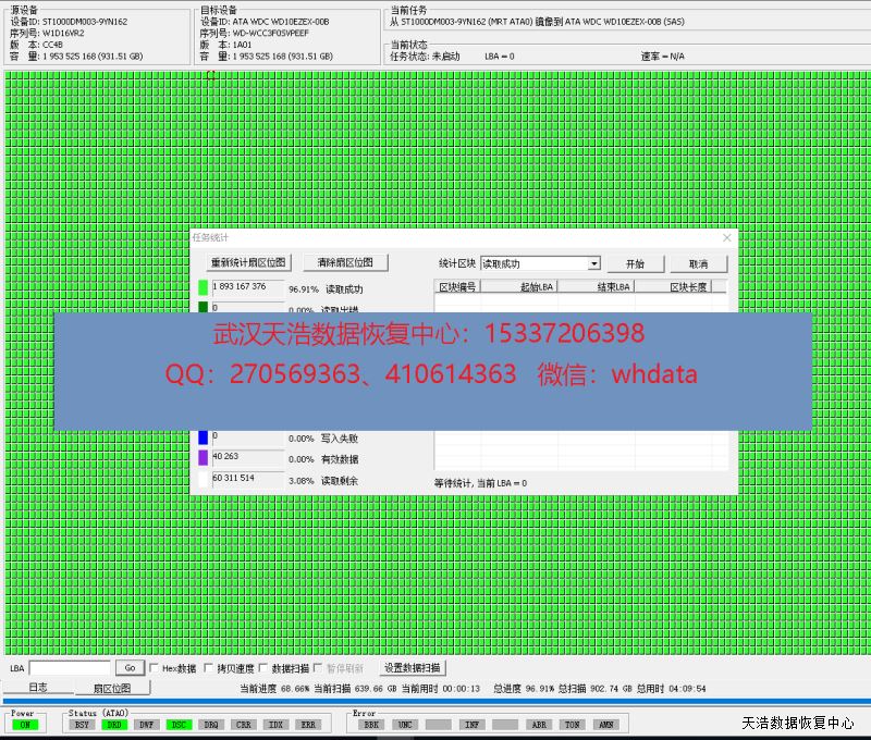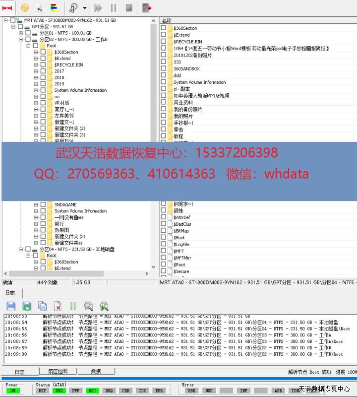 解决方案:收到硬盘后,接到数据恢复工具上,通电硬盘不认盘,终端不能正常转T,我们修复固件后,发现硬盘一个磁头不良,在无尘环境更换兼容的磁头,再断电通电,硬盘正常认盘 ,DE分头镜像,成功恢复硬盘里面的几乎全部资料!