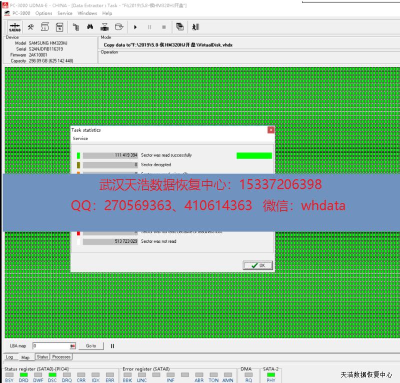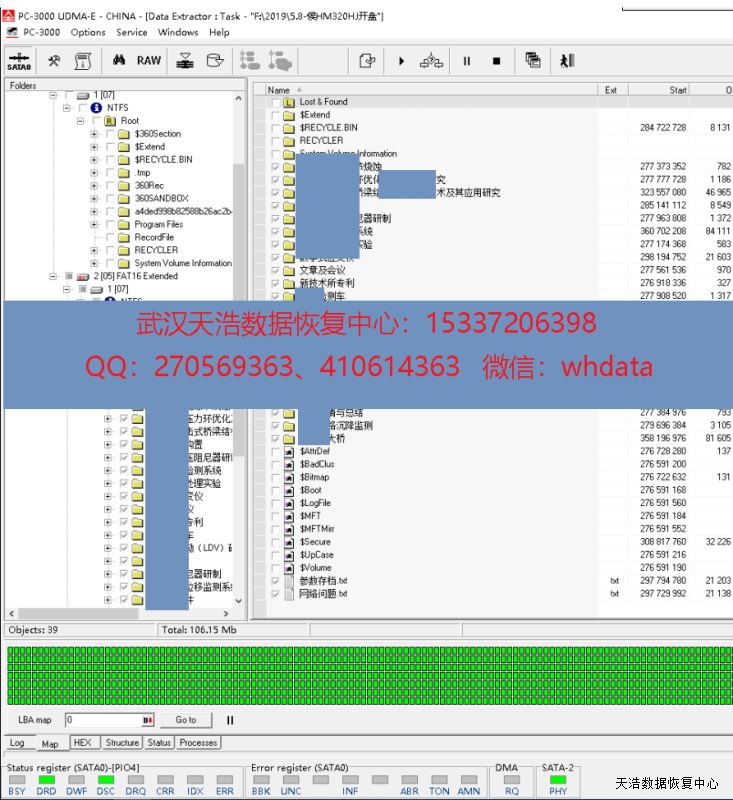 解决方案:收到硬盘后,我们在无尘环境更换兼容的磁头,再接到数据恢复工具PC-3000 UDMA Express上,硬盘正常认盘,DE分头镜像,成功恢复硬盘里面的几乎全部数据!