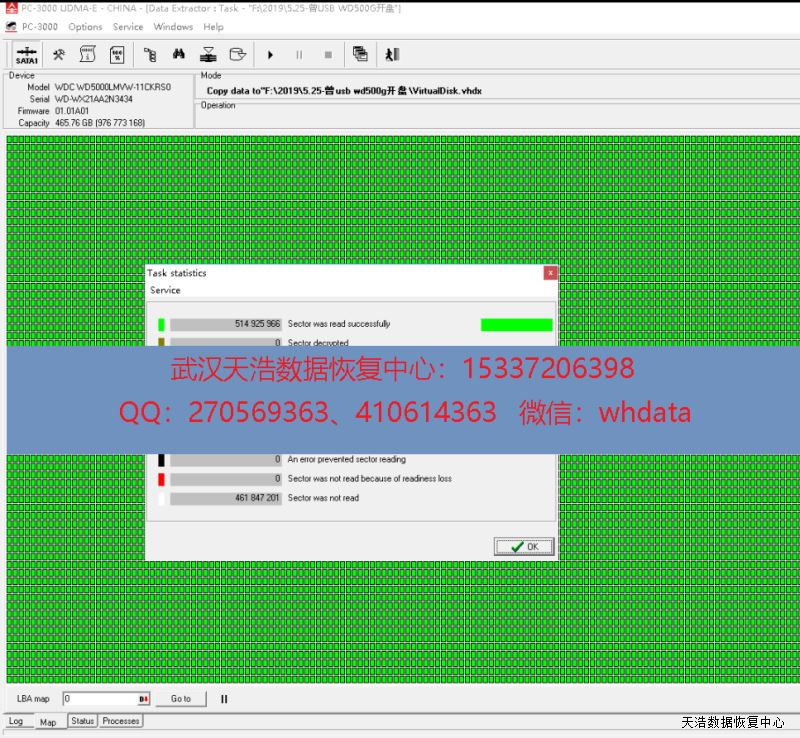 解决方案:收到硬盘后,我们更换兼容的无锁SATA电路板,再接到专业数据恢复工具PC3000 UDMA-E上,通电检测发现0头好1头不良,在无尘环境更换兼容的磁头后,再通电DE镜像,成功恢复硬盘里几几乎全部数据!