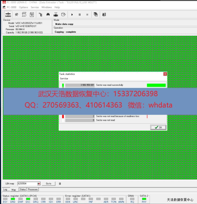 解决方案:收到硬盘后,我们更换兼容无锁的SATA电路板,再接到专业数据恢复工具PC3000 UDMA-E上,通电检测修复固件,再断电通电,硬盘正常认盘,DE镜像,成功恢复硬盘里内几乎全部工作数据!