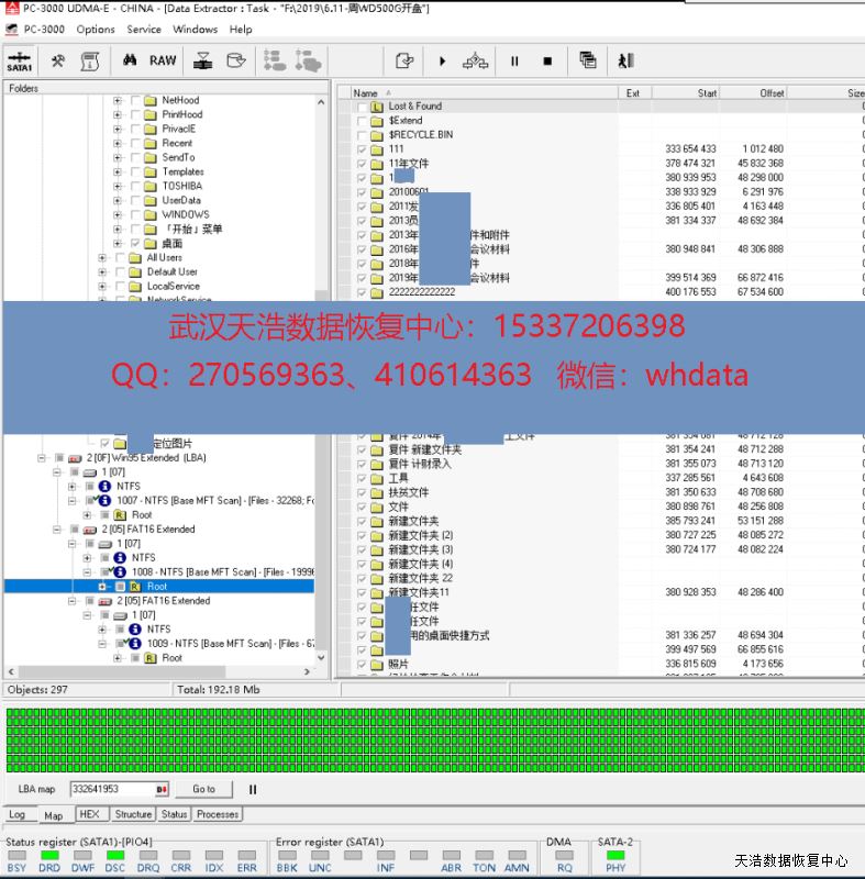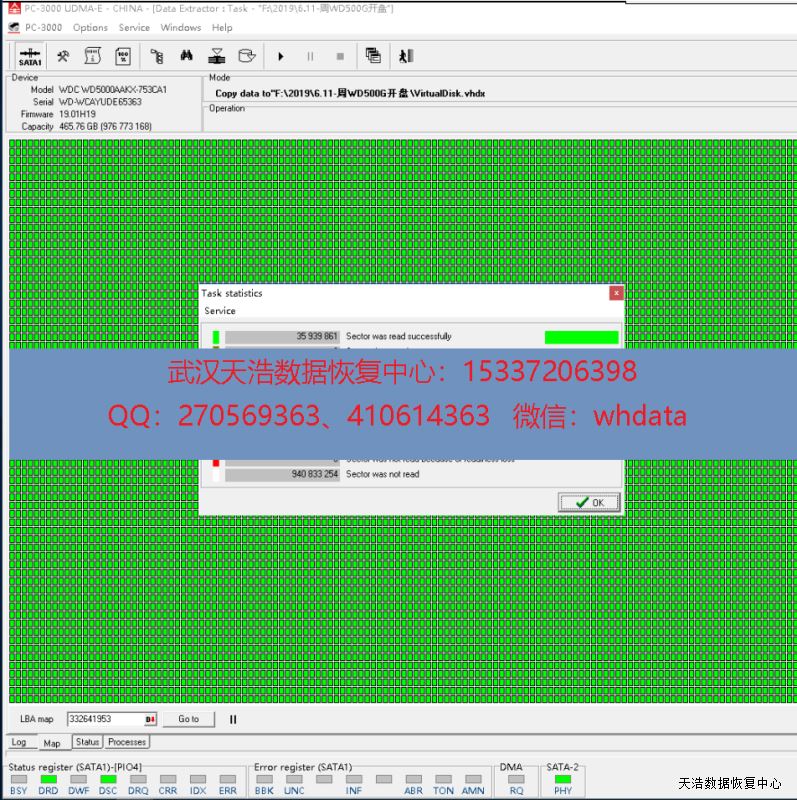 解决方案:收到硬盘后,我们在无尘环境更换兼容的磁头,然后接到专业数据恢复工具PC3000 UDMA-E上,通电硬盘正常认盘,DE镜像,成功恢复硬盘内客户公司的几乎全部工作数据!