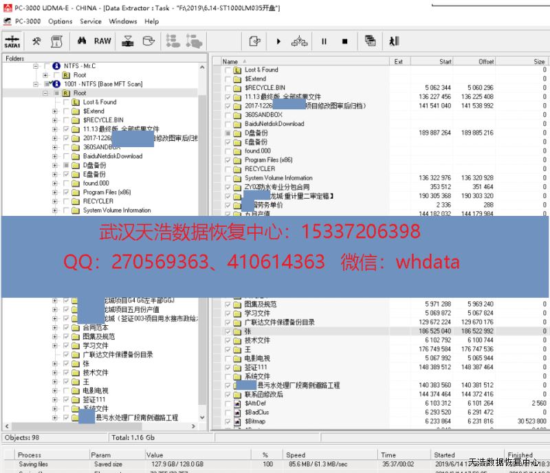 解决方案:收到硬盘后,我们在无尘环境更换兼容的磁头,再接到数据恢复工具PC-3000 UDMA Express上,通电,硬盘正常认盘,DE镜像,成功恢复硬盘内几乎全部数据!