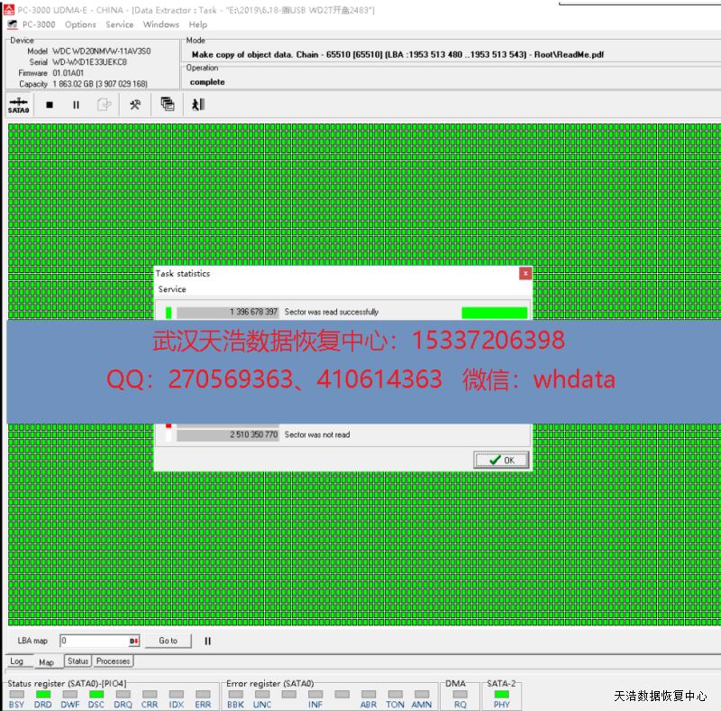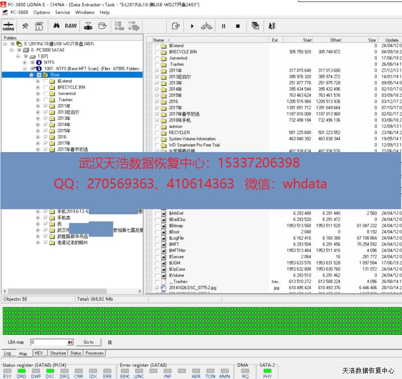 解决方案:收到硬盘后,我们在无尘环境更换兼容的磁头,再接到专业数据恢复工具PC3000 UDMA-E上,通电硬盘正常认盘,DE镜像,成功恢复硬盘里内几乎全部数据!里面大多为照片。