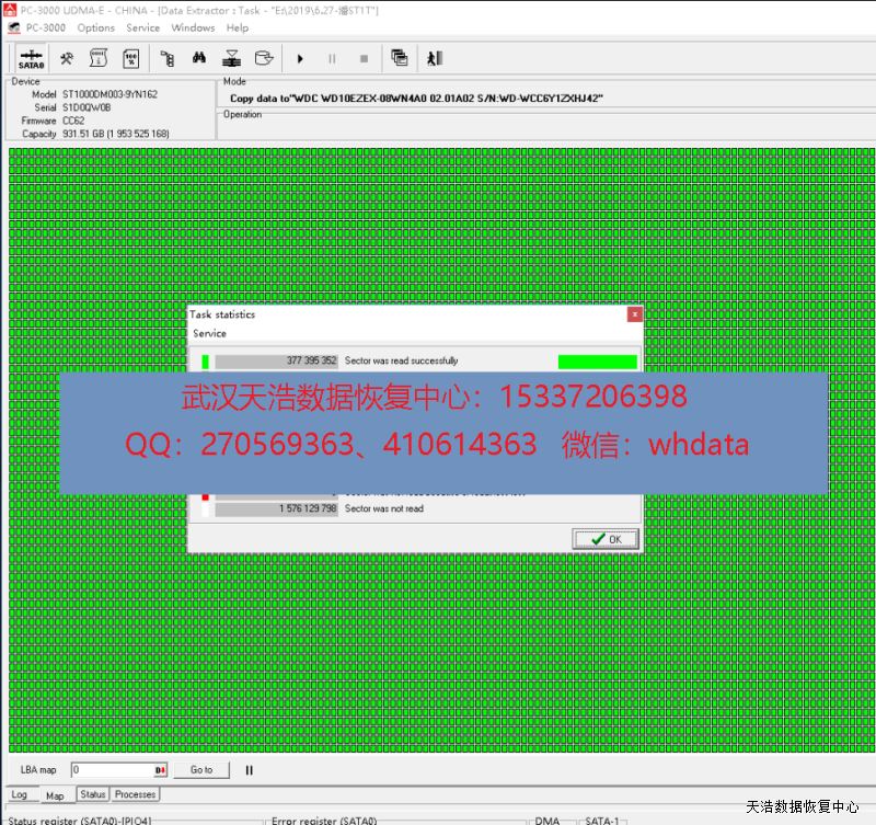 解决方案:收到硬盘后,我们接到数据恢复工具PC-3000 UDMA Express上,检测发现固件问题,处理固件后,断电通电硬盘认盘,DE建立镜像任务,分头镜像,发现有一个磁头不良,我们在无尘环境更换兼容的全好磁头,再通电镜像,成功恢复硬盘内几乎全部数据!